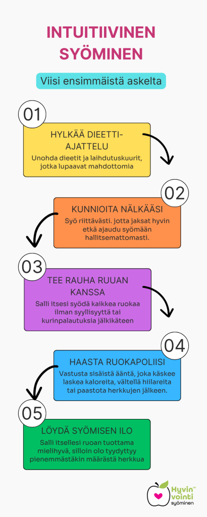 Intuitiivinen syöminen on laihdutusajattelusta vapaa lähestymistapa, jossa tavoitteena on kuunnella kehon omia signaaleja (nälkä, kylläisyys), hylätä ulkoiset ruokasäännöt ja rakentaa tervettä ruokasuhdetta.